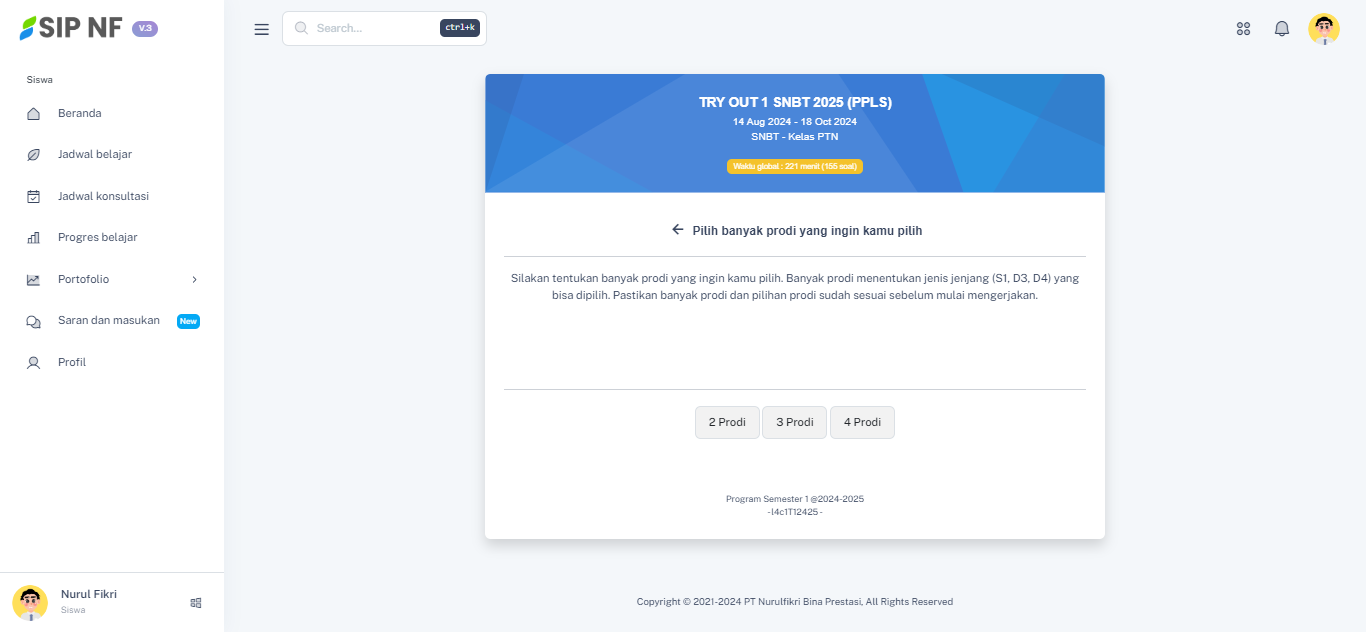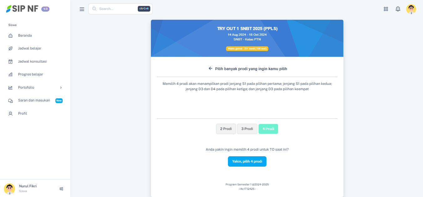 Tentukan jumlah prodi sesuai dengan minat kamu, dengan pilihan antara 2, 3, atau 4 prodi. Banyaknya prodi yang kamu pilih akan menentukan jenjang pendidikan (S1, D3, D4) yang tersedia. Pastikan kamu telah memutuskan pilihan yang sesuai sebelum memulai try out.