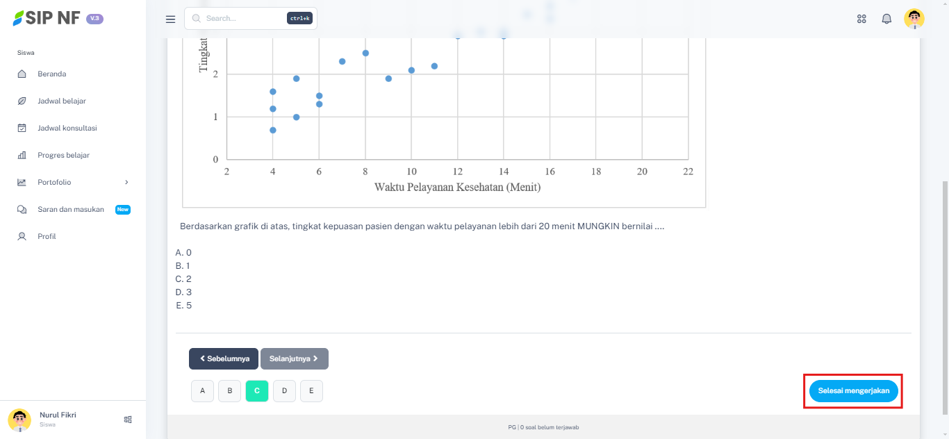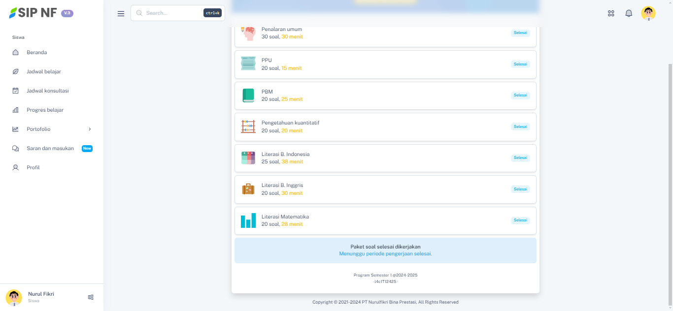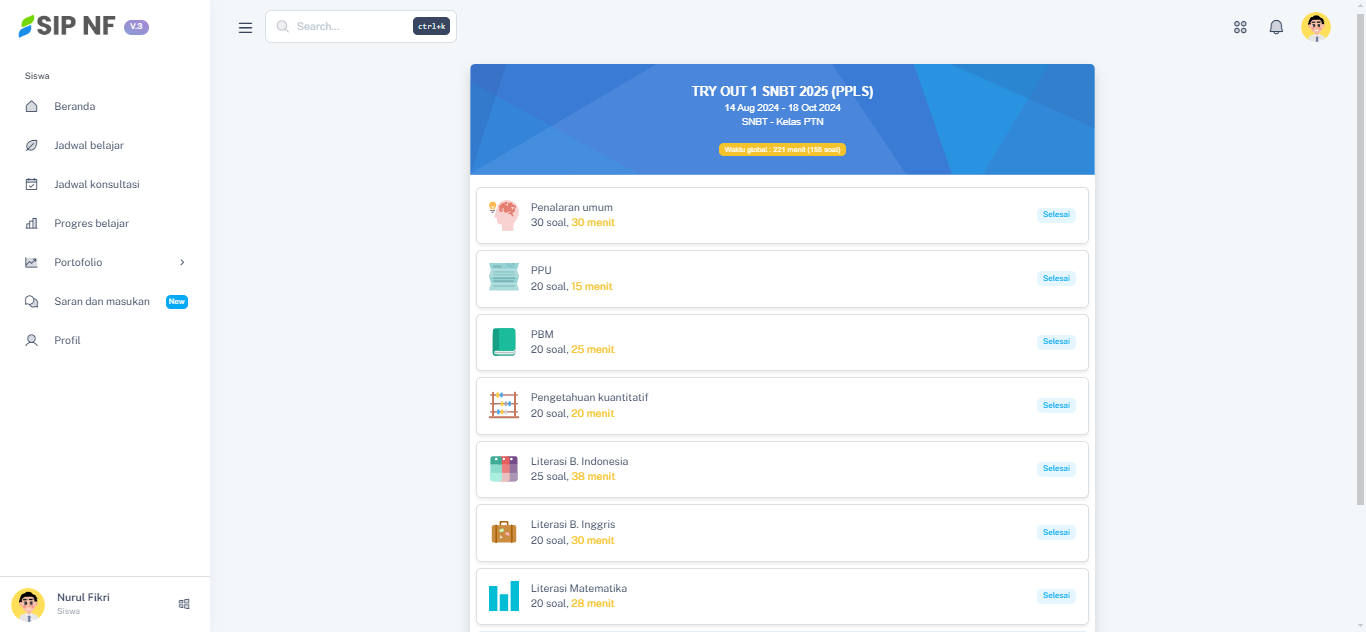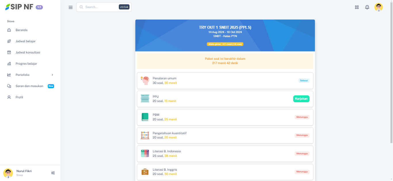 Terdapat 7 bidang studi yang dapat kamu kerjakan secara urut beserta informasi timer hitung mundur.