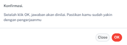 Perhatian! Akan muncul popup seperti di bawah ini yang menanyakan apakah kamu yakin ingin mengirimkan jawaban atau tidak. Jika yakin, kamu bisa menekan tombol "OK" dan jika tidak kamu bisa menekan tombol "CLOSE".