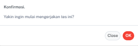 Perhatian! Akan muncul popup seperti di bawah ini yang menanyakan apakah kamu yakin ingin mengerjakan tes atau tidak. Jika yakin, kamu bisa menekan tombol "OK" dan jika tidak kamu bisa menekan tombol "CLOSE".