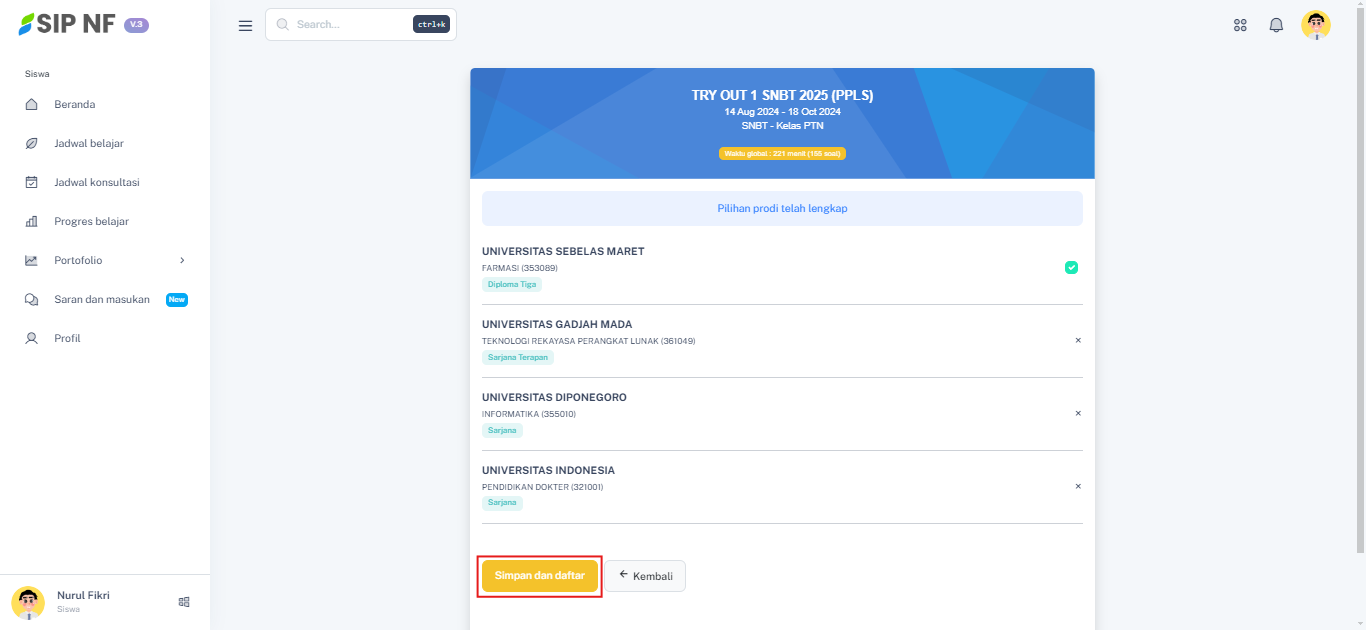 6. Setelah keempat pilihan prodi telah lengkap diisi, maka secara otomatis kamu akan diarahkan ke halaman berikut. Kamu bisa menekan tombol "SIMPAN DAN DAFTAR" jika sudah yakin terhadap prodi yang kamu pilih.