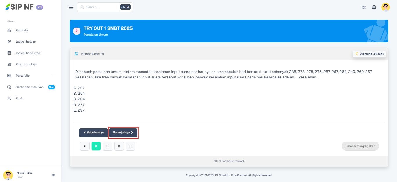 8. Setelah menjawab pop up tersebut kamu akan diarahkan ke halaman pengerjaan soal. Sama seperti tes sebelumnya, kamu diminta untuk menjawab seluruh pertanyaan dengan menekan tombol jawaban yang tertera di bawah soal. Jika sudah, kamu bisa tekan tombol "SELANJUTNYA" untuk menjawab soal berikutnya.