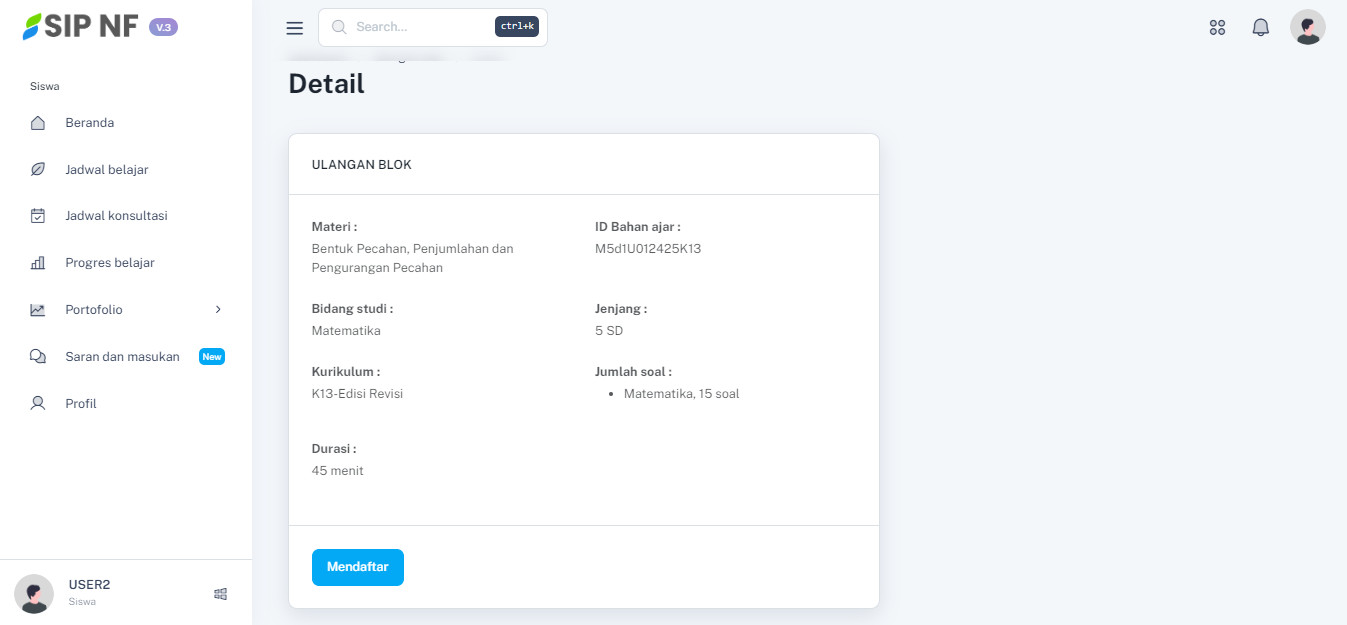 Berikut adalah tampilan layar dari fitur ulangan blok yang berisi card informasi mengenai detail tes sebelum diujikan. Jika sudah selesai membaca detailnya, kamu bisa tekan tombol "MENDAFTAR" untuk menuju halaman lembar soal.
