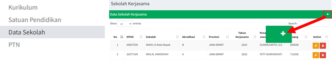 2. Pilih "menu Data Sekolah", lalu klik ikon (+) di bawah ini.