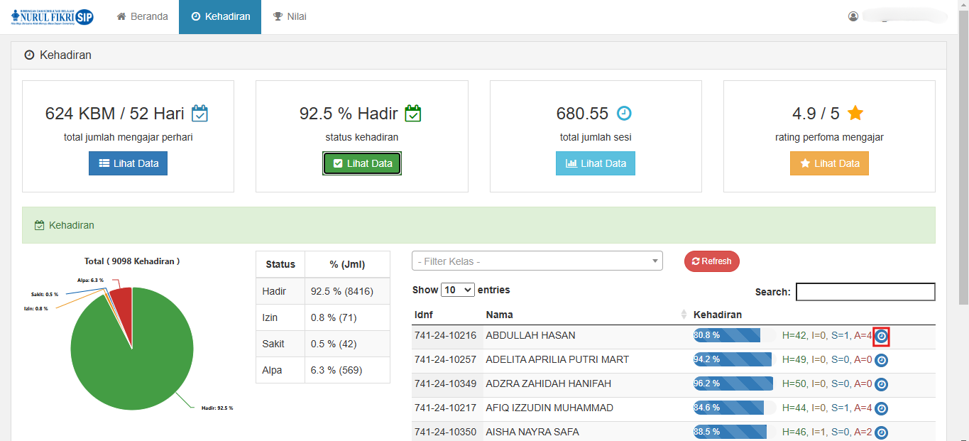 Misalnya, untuk panduan kali ini, kita akan melihat detail kehadiran siswa yang bernama ABDULLAH HASAN dengan idnf 741-24-10216.