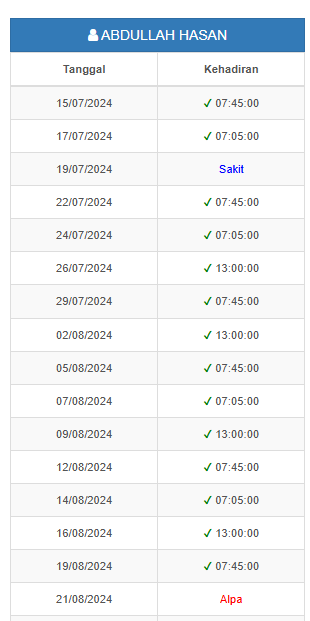 Dari gambar di atas, dapat disimpulkan bahwa Abdullah Hasan memiliki tingkat kehadiran sebesar 80.8%, dengan rincian: