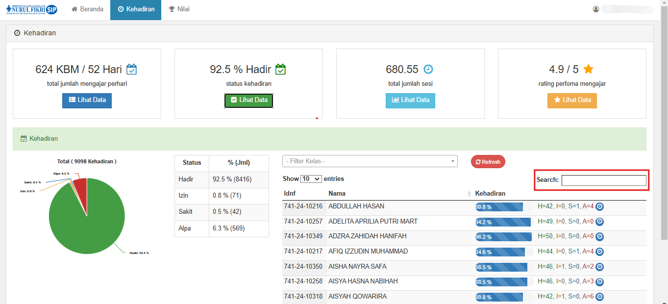 1. Masih di halaman status kehadiran, anda bisa mencari nama siswa yang diinginkan untuk dilihat laporan kehadirannya.