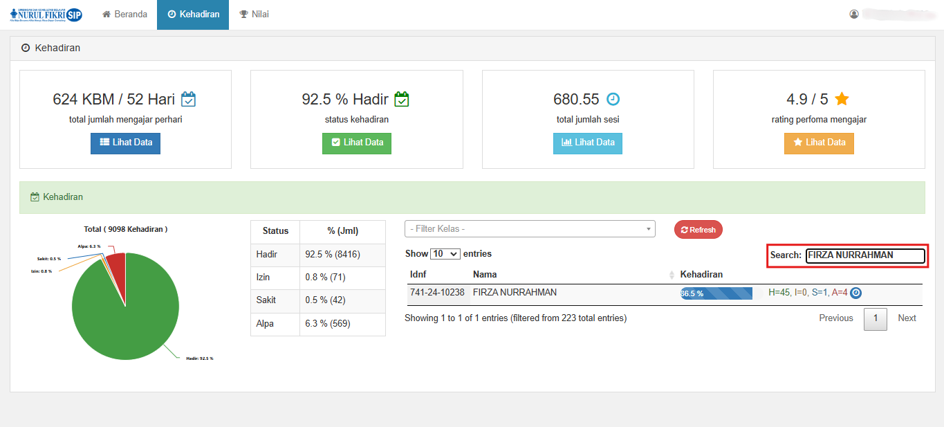 Misalnya, untuk panduan kali ini, kita akan melihat kehadiran siswa yang bernama FIRZA NURRAHMAN dari kelas 741-24-10238.